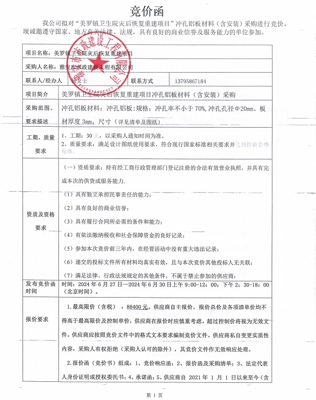 石棉縣美羅鎮(zhèn)衛(wèi)生院災(zāi)后恢復(fù)重建項(xiàng)目沖孔鋁板材料(含安裝)采購競價(jià)公告