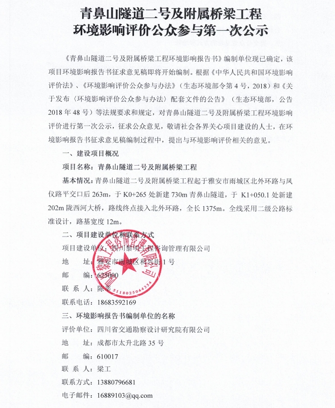 青鼻山隧道二號(hào)及附屬橋梁工程項(xiàng)目環(huán)境影響評(píng)價(jià)公眾參與第一次公示