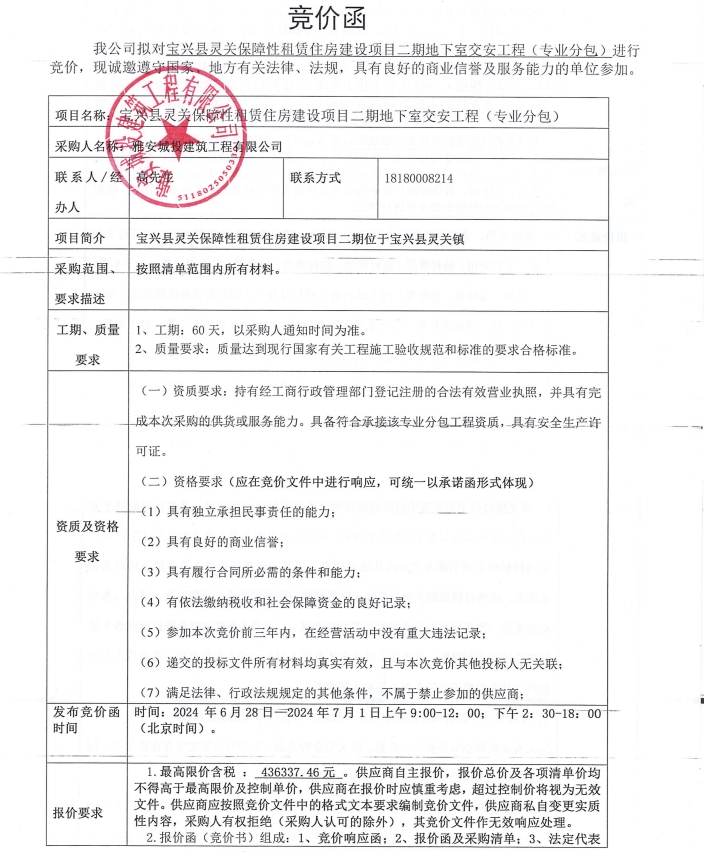 寶興縣靈關(guān)保障性租賃住房建設(shè)項(xiàng)目二期地下室交安工程(專業(yè)分包)競價公告