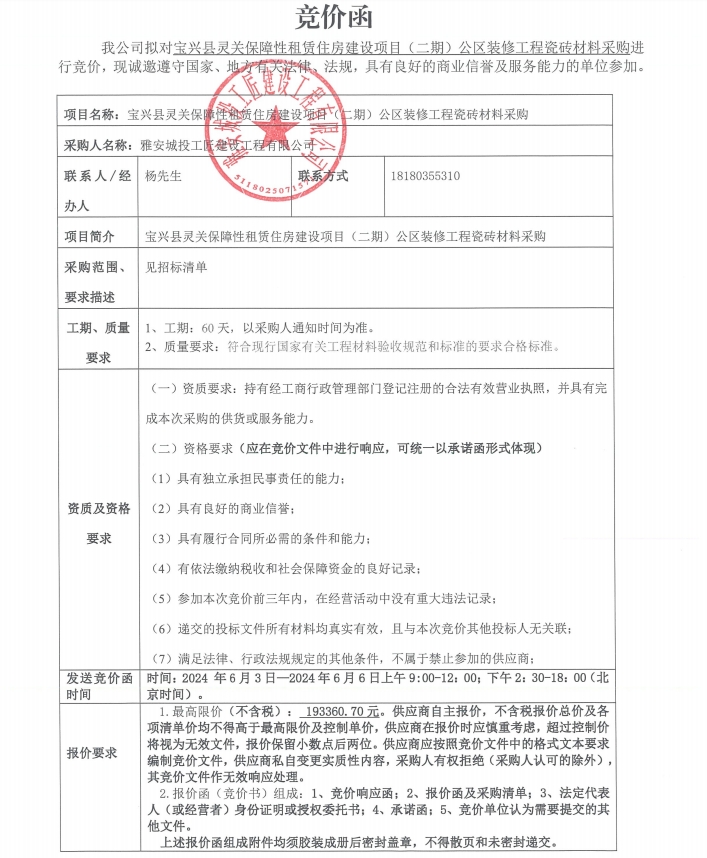 寶興縣靈關(guān)保障性租賃住房建設(shè)項(xiàng)目(二期)公區(qū)裝修工程瓷磚材料采購(gòu)競(jìng)價(jià)公告