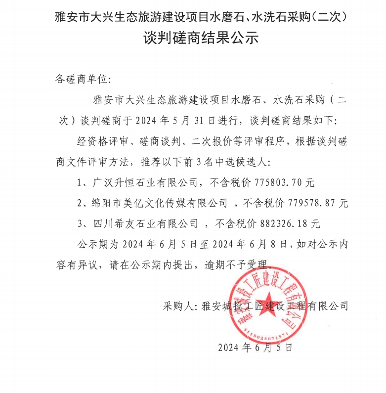 雅安市大興生態(tài)旅游建設(shè)項(xiàng)目水磨石、水洗石采購(gòu)(二次)談判磋商結(jié)果公示