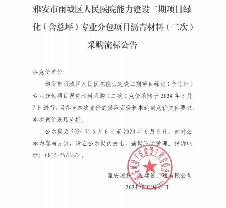 雅安市雨城區(qū)人民醫(yī)院能力建設二期項目綠化(含總坪)專業(yè)分包項目瀝青材料(二次)采購流標公告