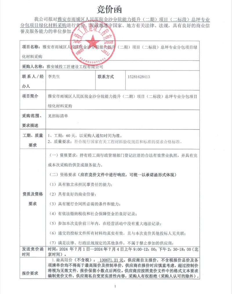 雅安市雨城區(qū)人民醫(yī)院金沙分院能力提升(二期)項(xiàng)目(二標(biāo)段)總坪專(zhuān)業(yè)分包項(xiàng)目綠化材料采購(gòu)競(jìng)價(jià)公告