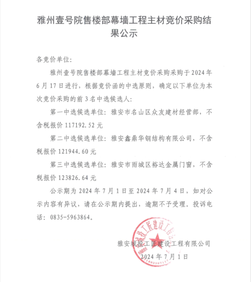 雅州壹號院售樓部幕墻工程主材競價(jià)采購結(jié)果公示