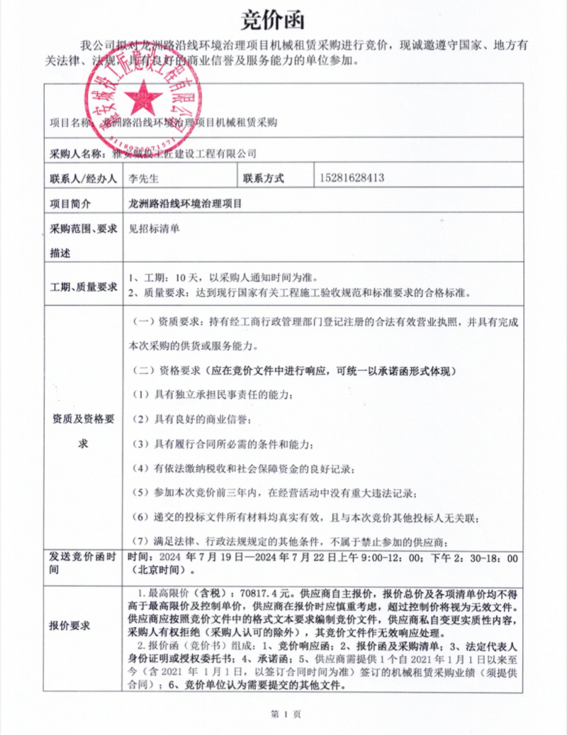 龍洲路沿線環(huán)境治理項目機械租賃采購競價公告