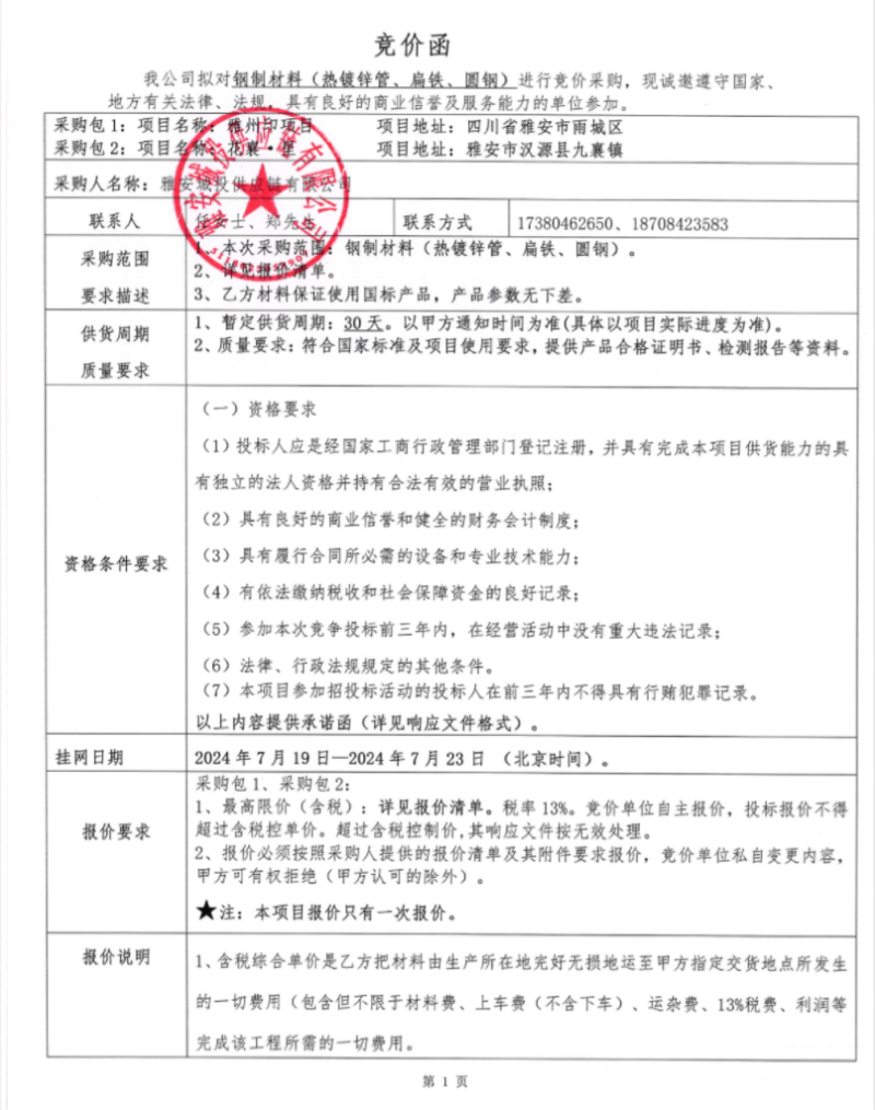 附件4:雅州印項(xiàng)目鋼制材料(熱鍍鋅管、扁鐵、圓鋼)采購(gòu)-報(bào)價(jià)清單