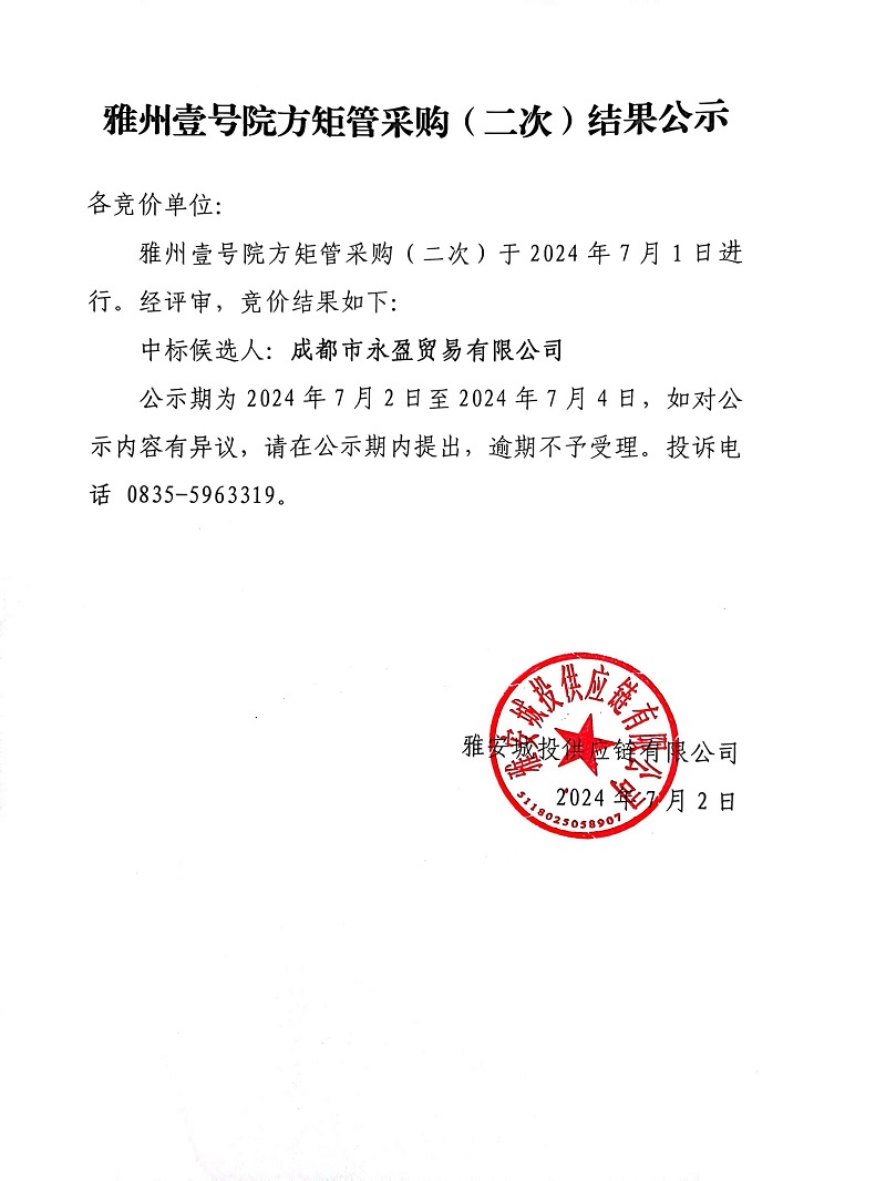 雅州壹號院方矩管采購(二次)結(jié)果公示