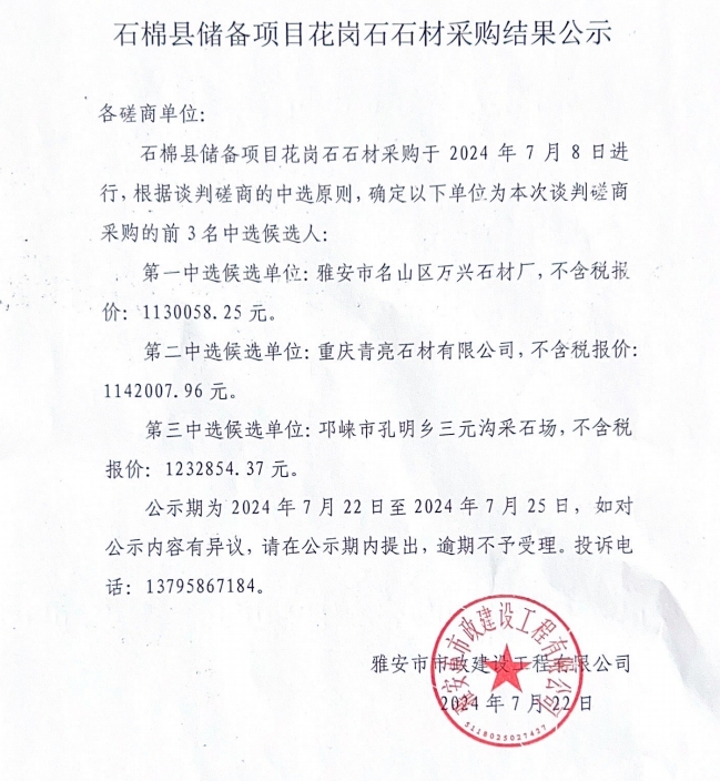 石棉縣儲(chǔ)備項(xiàng)目花崗石石材采購結(jié)果公示