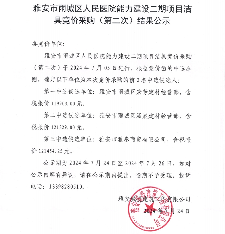 雅安市雨城區(qū)人民醫(yī)院能力建設(shè)二期項(xiàng)目潔具競價(jià)采購(第二次)結(jié)果公示