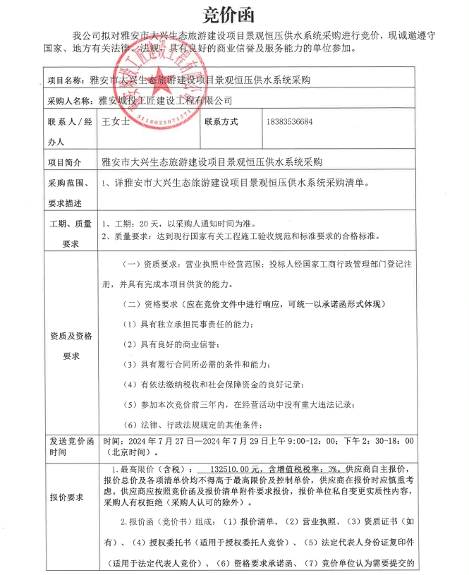 雅安市大興生態(tài)旅游建設(shè)項(xiàng)目景觀恒壓供水系統(tǒng)采購(gòu)競(jìng)價(jià)文件
