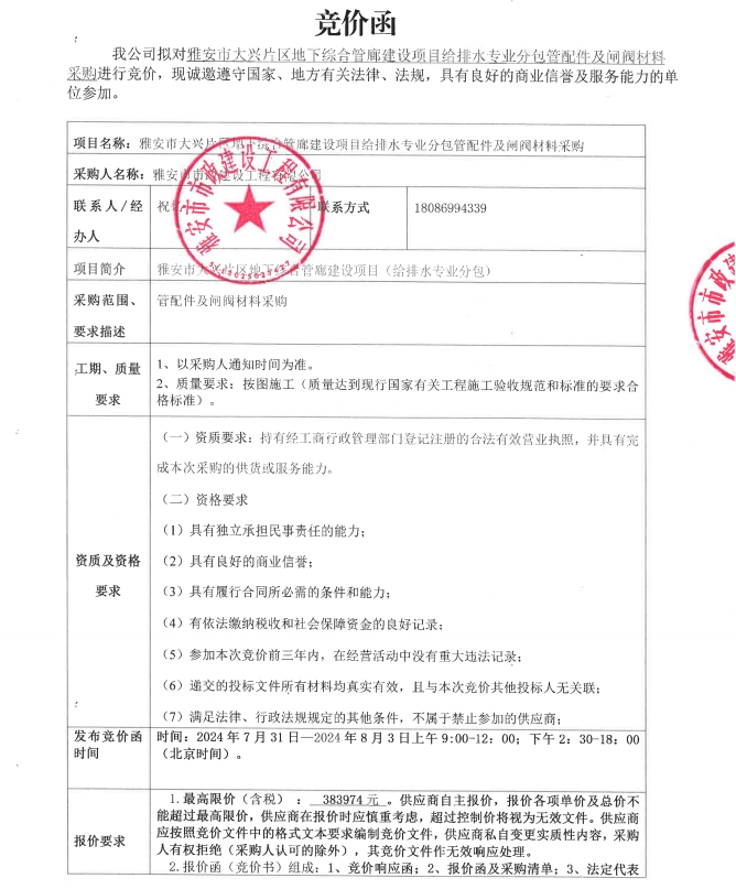 雅安市大興片區(qū)地下綜合管廊建設(shè)項(xiàng)目給排水專(zhuān)業(yè)分包管配件及閘閥材料采購(gòu)競(jìng)價(jià)公告