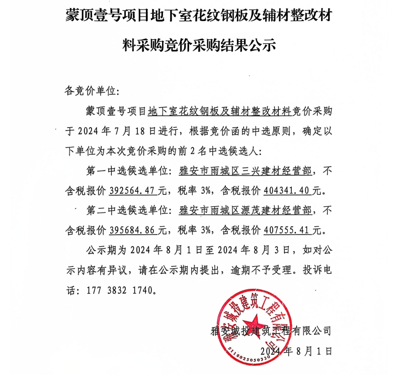 蒙頂壹號項目地下室花紋鋼板及輔材整改材料采購競價采購結果公示
