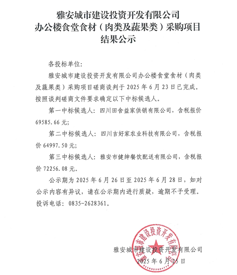 雅安城市建設(shè)投資開發(fā)有限公司城投辦公樓食堂食材(肉類及蔬果類)采購項目結(jié)果公示