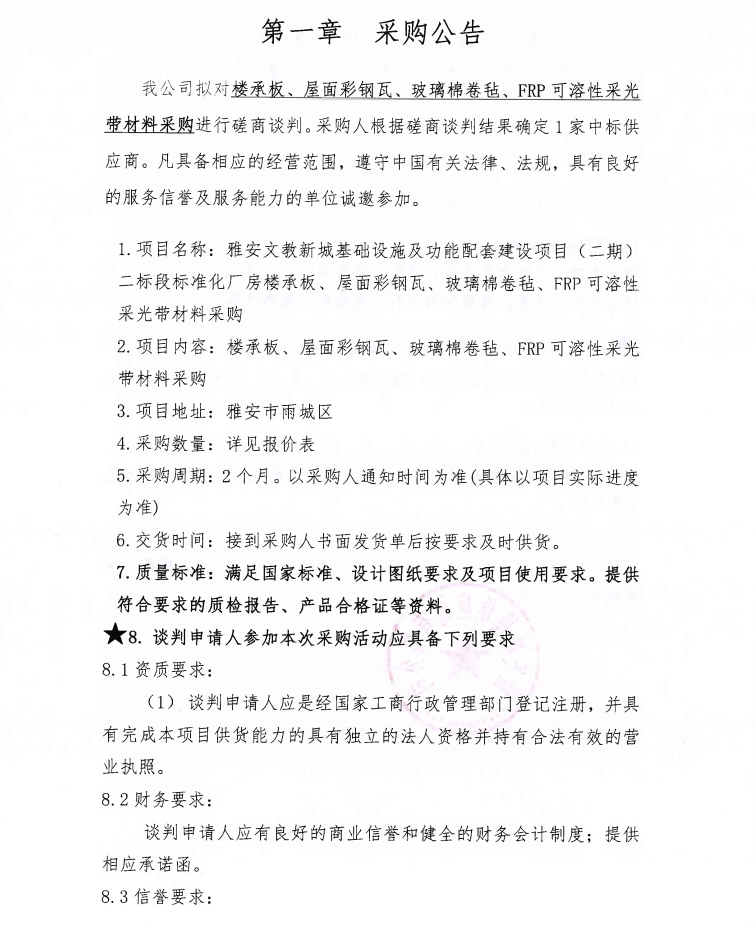 雅安文教新城基礎(chǔ)設(shè)施及功能配套建設(shè)項(xiàng)目(二期)二標(biāo)段標(biāo)準(zhǔn)化廠房樓承板、屋面彩鋼瓦、玻璃棉卷氈、FRP可溶性采光帶材料采購(gòu)公告