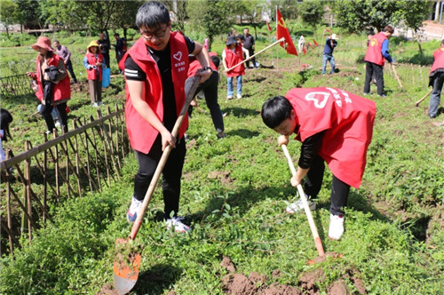 在張碗村“一碗果蔬”基地,志愿者們與村民協(xié)作種植菜苗,田地間一片春耕忙碌的景象。經(jīng)過半天的耕作,志愿者隊伍完成了600株菜苗的種植。